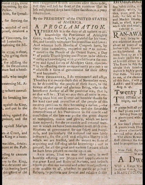 Now, therefore, I do recommend and assign Thursday, the 26th day of November next, to be devoted by the people of these States to the service of that great and glorious Being who is the beneficent author of all the good that was, that is, or that will be; that we may then all unite in rendering unto Him our sincere and humble thanks for His kind care and protection of the people of this country previous to their becoming a nation; for the signal and manifold mercies and the favorable interpositions of His providence in the course and conclusion of the late war; for the great degree of tranquility, union, and plenty which we have since enjoyed; for the peaceable and rational manner in which we have been enable to establish constitutions of government for our safety and happiness, and particularly the national one now lately instituted' for the civil and religious liberty with which we are blessed, and the means we have of acquiring and diffusing useful knowledge; and, in general, for all the great and various favors which He has been pleased to confer upon us.